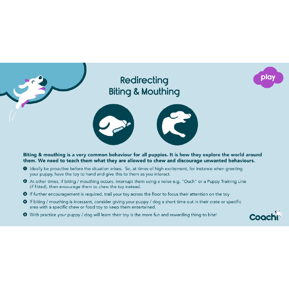 The Coachi Tuggi Tug is the perfect mixture of a tug of war dog toy and a rope toy. It’s longer length makes it great for playing tug and also as a fun and enticing toy for games and rewarding recall, it can also help interrupt play biting & chewing. More Info How it works: 1.