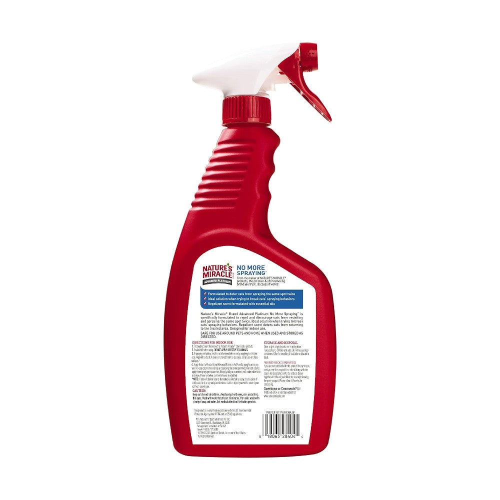 Apply Nature’s Miracle Brand Advanced Platinum No More Spraying to areas you want to keep cats from revisiting and spraying the same spot twice. For best results, apply three sprays per square foot. Reapply daily or as needed until undesirable habit is broken. Praise cat when positive behavior is exhibited.