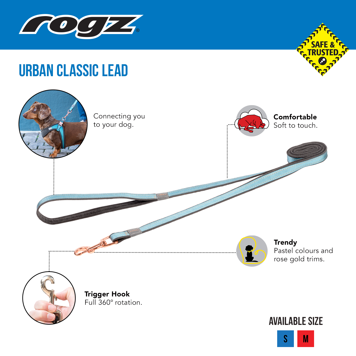 Rogz Handsfree lead designed with dual adjustability, both the waist band and lead length are adjustable to different lengths, offering versatility in use. The shock absorbing webbing reduces strain on both you and your dog while the close control handle improves control in high traffic zones. Reflective stitching for night-time visibility and safety in various conditions.