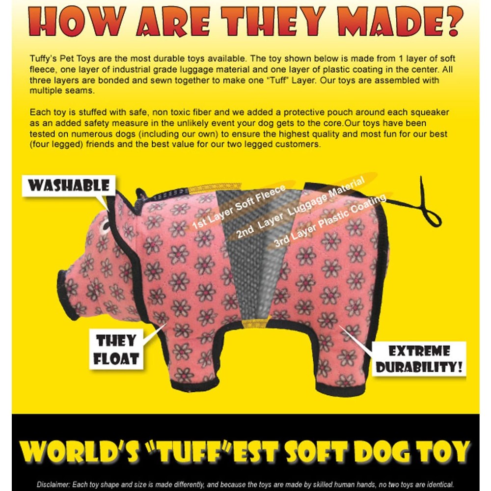 SAFETY FIRST! – Tuffy Toys are “Built to Last”, but keep in mind no toy will last forever. This toy is designed as an interactive “play” toy and is not a chew toy. No part of the toy should be ingested. Dog toys are meant for you and your pet to enjoy together. Don’t allow your pet to play with any toy unsupervised. Remember to be a responsible parent and stay close when your dog is playing with any dog toys.